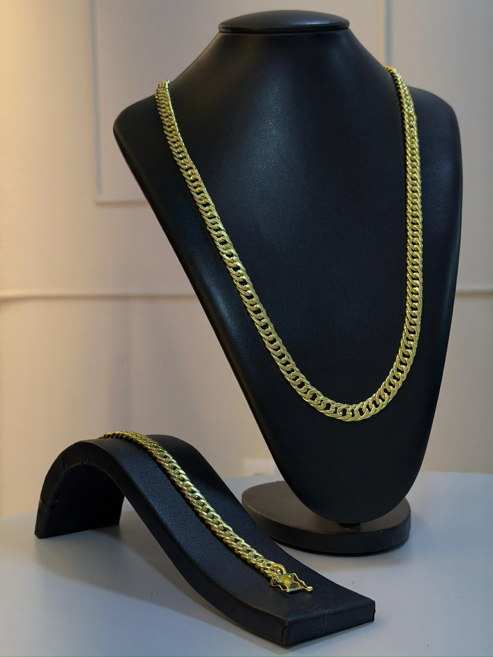 Produzido 100% na moeda antiga, o kit garante excelente resistência e acabamento premium. A corrente e a pulseira formam um conjunto perfeito para quem gosta de acessórios combinando, valorizando ainda mais o visual com brilho intenso e presença marcante.